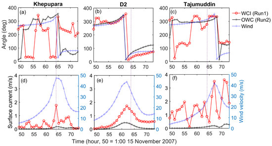 The ‘WCI’ (Run 1) scenario produces a higher SWH compared to the ‘Only Wave’ (Run 2 in Table 1) scenario. Both the scenarios are conducted by applying the same wind field and considered all the wave dissipation processes. The only difference concerns the influence of the current and water level variations in the ‘WCI’ (Run 1) scenario. The results show that the generation of the wind–wave is increased in the ‘WCI’ scenario for all stations. The effective wind determines the wind–wave growth, i.e., the relative wind effect (defined as the vectorial difference between the wind vector and current vector [30]). To investigate the increase in the SWH in the ‘WCI’ (Run 1) scenario further, the amplitude and direction of the current and wind are examined at three different stations: Khepupara, D2, and Tajumuddin (Figure 3). The wave-driven current is computed from the ‘OWC’ (Only Wave-driven, Run 2 in Table 1) scenario. The same wind field as the ‘WCI’ (Run 1 in Table 1) scenario is used to produce the wind–wave. Figure 3a shows that the current direction is in the opposite direction to the wind direction in the ‘WCI’ (Run 1) scenario at Khepupara, whereas both the current and wind are in the same direction in the ‘OWC’ (Run 2) scenario. The ‘WCI’ (Run 1) scenario produces a 1.6 m s−1 higher magnitude of surface current than the ‘OWC’ scenario (Figure 3d) with a correspondingly higher effective wind stress at Khepupara. This higher effective wind stress produced by the wind–current interaction produces a higher SWH than the ‘Only Wave’ (Run 2) in Figure 2. Conversely, the ‘WCI’ (Run 1) scenario generates a higher magnitude of surface current at D2, but both the current and wind direction are almost in the same direction (Figure 3b,e). The current and wind direction are also in the same direction at Tajumuddin for both the scenarios during the strong-wind period (>20 m s−1). Similar directions of the current and the wind reduce the effective wind stress magnitude, which causes a lower generation of wind-driven waves [30]. When the current and winds are in opposite directions, it produces a higher effective wind stress, which increases wind–wave generation (Sin in Equation (7)). This illustrates that the WCI can generate higher amplitude waves by modifying the effective wind stress by changing the current direction with respect to the wind direction. Therefore, the ‘WCI’ (Run 1) scenario generates a higher SWH than the ‘Only Wave’ (Run 2) scenario at Khepupara. Further influence of the current and wave direction on the SWH is discussed in the next section.