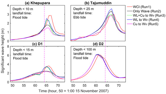 Influence of different parameters on significant wave height variations during Cyclone Sidr for different scenarios at (a) Khepupara, (b) Tajumuddin, (c) D1, and (d) D2. The purple dashed line denotes the landfall time 15:00 15 November 2007 (64 h).
