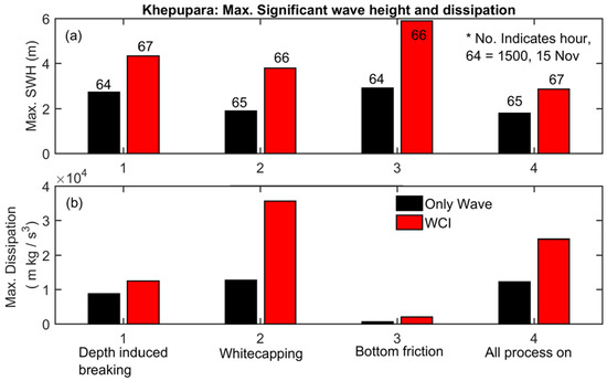 Thus, the higher amplitudes of the maximum SWH and wave energy dissipation at Khepupara result from increased effective wind stress and increased wave steepness, respectively. The opposite directions of current and wind increase the effective wind stress, which results in higher generation of wind-driven waves. Conversely, the opposite directions of waves and current increase the wave energy and also result in increased wave steepness. Higher wave energy causes a higher magnitude of wave energy dissipation (due to the wave energy term in all the dissipation equations, Equation (10)). Finally, the dissipation related to the whitecapping term in Equation (7) is more sensitive than the dissipations related to the depth-induced breaking and the bottom friction during a cyclone-induced storm-surge event at Khepupara. The wave–current interaction plays a significant role in estimating wave energy dissipation and significant wave height.