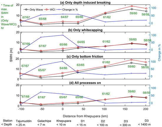 Maximum significant wave height variations along the Bay of Bengal for “Only Wave” and “Wave-Current interaction” conditions under (a) Only depth-induced breaking, (b) Only whitecapping, (c) Only bottom friction, and (d) All wave dissipation processes. Maximum amplitudes of the SWH are observed at different times of the cyclone for different scenarios. A positive distance represents the oceanward direction. Change in % = (WCI-Only Wave)/Only Wave %.