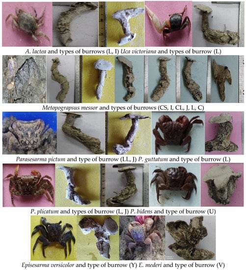 Burrow shape varied with crab species. Metopograpsus messor displayed the maximum number of six types of burrow shape (L, I, CS, C, CL, J), followed by four types in Austruca occidentalis (L, JU, Y, X), Gelasimus vocans (I, S, J, V) and A. annulipes (I, LL, J, Y). Two types of burrows were found in A. lactea (L, I), A. variegata (I, J), Parasesarma plicatum (L, J) and P. pictum (LL, J). Only one type of burrow was found in Austruca cryptica (I), Parasesarma bidens (U), Uca victoriana (L), P. guttatum (L), Episesarma mederi (V), and E. vesicolor (Y).
