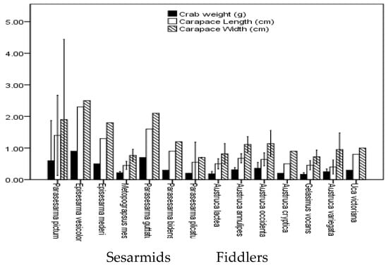 The crab size in terms of weight, carapace length and width for 14 species is shown in Figure 3. Crab weight varied from 0.17 to 0.36 g for fiddlers, and from 0.22 to 0.90 g for sesarmids. It was the highest in Austraca occidentalis and Episesarma versicolor, and the lowest in Gelasimus vocans and Metopograpsus messor. The crab weight was in correlation with carapace width (r = 0.95), carapace length (r = 0.93), BOD (r = 0.92), MBL (r = 0.48), TBL (r = 0.44), TBD (r = 0.44), and BV (r = 0.38).