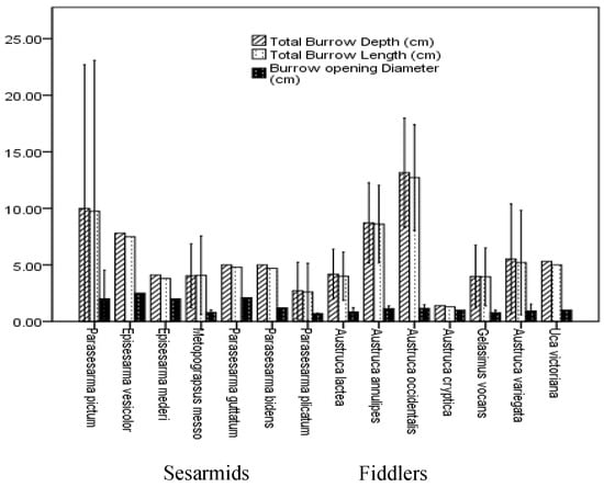 Total burrow depth (TBD) varied from 1.4 to 13.16 cm for fiddlers and from 2.7 to 10 cm for sesarmids. TBD was the highest in Austruca occidentalis and Parasesarma pictum and the lowest in Austruca cryptica and Parasesarma plicatum (Figure 6). The TBD was in correlation with TBL (r = 0.99), BV (r = 0.81), BOD (r = 0.39), burrow shape (r = 0.36), crab weight (r = 0.44), carapace width (r = 0.40) and carapace length (r = 0.30).