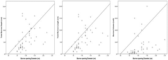 Relationship between burrow opening diameter and total burrow length (r = 0.40) and total burrow depth (r = 0.39) at 1% level or burrow volume (r = 0.31; p < 0.05).