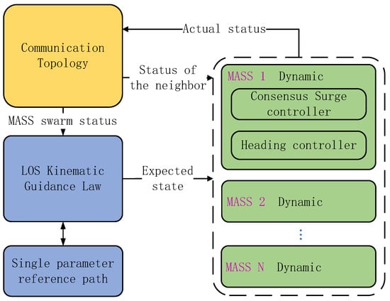 From the above research on MASS cooperative path tracking, it can be seen that the current MASS cooperative path tracking mainly focuses on the uncertain factors caused by MASS model and marine environment disturbances, as well as the speed and sideslip angle during navigation. Some results have been achieved in single ship path tracking, but when controlling a swarm of MASSs, the MASS communication structure coupled with the complexity of swarm control, makes it difficult to achieve effective path tracking. The swarm of MASSs is mainly controlled by the leader follower method, but with the increase of the scale of the swarm, and the complexity of operation tasks, the number of MASSs is increasing, and the leadership follower mode faces great challenges and a heavy burden of communication. At present, the consistency control method is the most widely studied, and it is the most extensive agent distributed control method. The MASS updates the status according to the control strategy, by exchanging information with a neighboring MASS, and finally reaches an agreement on a certain problem. The current research is the agent control considering the ideal situation, while the MASS belongs to the underactuated system, so it is difficult to control. It makes it difficult to apply the existing research results to control of a swarm of MASSs. In view of the problems encountered in the above discussion, we propose a cooperative path tracking method for use with a swarm of MASSs. The framework proposed in this paper is shown in Figure 1.