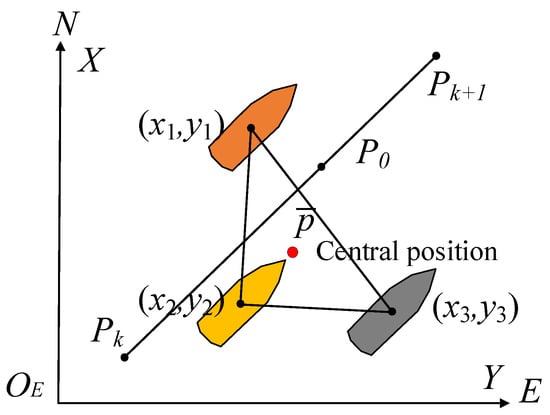 where Pn = [Pnx, Pny]T represents the position of a specific coordinate point in the geodetic coordinate system, and the point tracked by the center point of the designed swarm of MASSs is P0 = [P0x,P0y]T; P0 is always on the preset path point or arc. The cooperative path tracking of the above swarm of MASSs is shown in Figure 3.