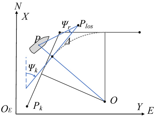 The angle between the longitudinal axis of the MASS and the longitudinal axis of the inertial coordinate system is called the expected LOS angle Ψlos, and there is the following relationship: