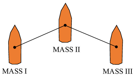 The heading torque controller and heave thrust controller for MASS were designed in Section 3.1 and Section 3.2, respectively. In order to verify the effectiveness of the proposed method, a group of three MASSs is considered in this section. The MASS Cybership of the Norwegian University of Science and Technology is taken as the simulation object [5]. The dynamic parameters are given by m1 = 16.790, m2 = 24.790, m3 = 2.760, d1 = 0.655, d2 = 1.330, d3 = 1.900. The input limits of heave thrust and heading torque are given by τumax = 4, τrmax = 3. The communication topology between the swarm is shown in Figure 6.