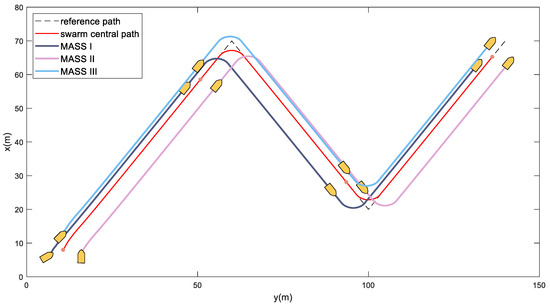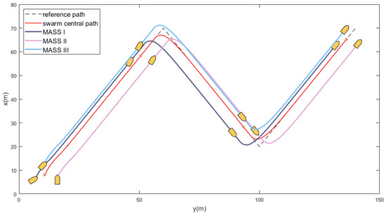 With the in-depth study of maritime autonomous surface ship (MASS) technology and sensor technology, ships will gradually become intelligent and unmanned. In December 2018, the 100th session of the IMO Maritime Safety Committee approved the framework and method for defining the regulatory scope of MASSs [1]. MASSs will become the development trend of marine intelligent technology. Due to the limitation of their range, UAVs have been unable to give full play to their practical value in sea missions, while MASSs have a strong endurance ability, low fuel consumption, can overcome the harsh extreme environment at sea, and have the advantages of autonomous control and convenient deployment. In 2017, the average daily fuel consumption of the cargo ship “Dazhi”, developed by the Chinese, could be reduced by about 4% [2]. In 2022, Zhuhai Cloud, the world’s first intelligent unmanned system mother ship, could carry more than 50 different unmanned systems [3]. MASSs have many advantages at sea. However, the ship motion has the typical characteristics of a large inertia, non-linearity, underdrive, and uncertainty, so it is difficult to control; the marine operation environment is complex [4]. In addition, limited by the complexity of the task, and the ability of a single MASS to perform the mission, a single MASS is very inefficient or may not be able to complete the task. Inspired by the biological swarm, a swarm is carried out by multiple agents, which have the distribution characteristics of time, space, information, and function. The cooperative control of a MASS swarm mainly includes collision avoidance, formation, path planning, tracking, and so on. Path tracking is the core technology of automatic control, including trajectory tracking and path tracking. The main difference between them is that path tracking is a parameterized path, there are no time constraints. Specifically, the path tracking goal of the MASS is to track a given route, without considering the time constraints. One goal is to track the route as much as possible to achieve a smooth tracking effect, and the other is to ensure that the speed of the ship meets the desired requirements.