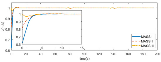 Figure 8 shows the surge velocity of three MASSs. The initial speed of each MASS is different, and the design desired speed is 1 m/s. From the surge velocity of 0–15 s, it can be seen that the speed of MASS III is the highest. Under the control of the consensus term in the heave thrust controller, it will actively slow down to “try” to make the speeds of the separate MASSs in the swarm converge. The speeds of the MASS I and II are lower and will actively accelerate, and the acceleration of the MASS I is larger than that of the II. Finally, the surge velocity of each MASS converges synchronously to the desired speed. At the same time, at the turning point, due to the introduction of the arc LOS guidance law, the speed of the MASS decreases slightly and converges to the desired speed when tracking in a straight line.