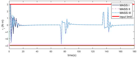 where r is the current heading angular velocity of the MASS, which is known from the kinematics of the MASS, there is an equation . The heading torque controller is designed as follows: