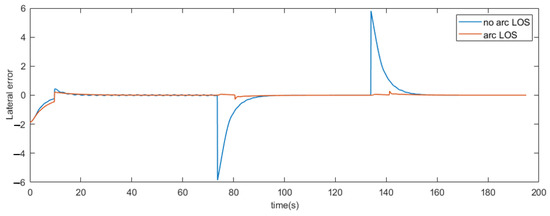 By the proposed control strategy, the swarm of MASSs can track a single-parameter path. Figure 7 shows the effect of path tracking of three MASSs. The discontinuous line is the given referenced single-parameter path, and the thick line is the simulation path of each MASS. It can be seen that, although the initial state of each MASS is different, the swarm of MASSs can track the referenced path well under the designed controller. In addition, because there is no demand for the formation location of the swarm, the computing center position of the MASS will only converge to the swarm center and track the reference path, but does not show a fixed formation shape. Compared with the results without arc LOS in Figure 11, and the lateral errors of the two methods in Figure 12, it can be seen that the ideal tracking effect can be obtained by using the arc LOS guidance law when changing path points, and the overall control effect and path tracking effect have been greatly improved due to the introduction of derivatives to reduce the jitter of MASS motion.