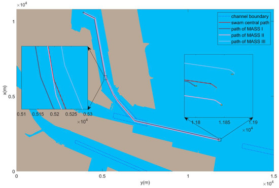 In order to further verify the algorithm proposed in this paper, we choose the environment of Tianjin Port, based on the research of Xiangyu Chen et al. [17], for the unmanned ship swarm in Tianjin’s mouth narrow channel planning path, the planning results are shown in Figure 13. The three MASSs in this section are used to track the planned path, given the initial state (x1,y1,Ψ1) = [11800,2100,pi/2]T, (x2,y2,Ψ2) = [11845,2040,0]T, (x3,y3,Ψ3) = [11864,12137,-pi/2]T. Figure 14 shows the tracking results of the three MASSs on the planned path.