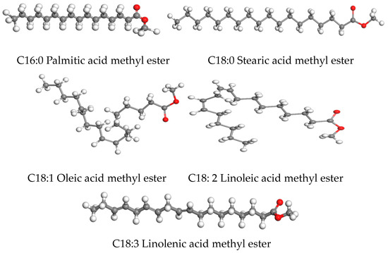 Molecular structure of each component in biodiesel (carbon: grey, hydrogen: white, oxygen: red).