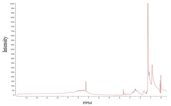 1HNMR spectra was used to interpret the chemical structures of asphaltene. Figure 4 shows the 1HNMR spectrum of asphaltene. The distribution of hydrogen is divided into four major integration intervals according to the chemical shift, the aromatic hydrogen HA, α hydrogen, β, and γ hydrogen on the substituents. The detailed results of each fraction are shown in Table 6. It can be seen that the β hydrogen takes the highest proportion, followed by the γ hydrogen, and the portion of α hydrogen and aromatic hydrogen are similar, indicating that the aliphatic side chains in the aromatic ring structure of the sample asphaltenes are relatively short, mainly α-methyl, α-methylene, α-methine, which agrees with the findings of the FTIR analysis.