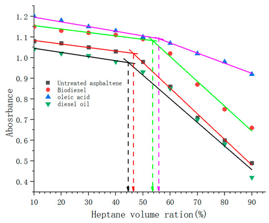 From the previous research, we know that the concentration of the asphaltene in the solution is proportional to the absorption peak of the UV-Vis [45]. Figure 6 plots the asphaltene absorbance intensity at different n-heptane percentages in the presence and absence of various inhibitors at a concentration of 200 mg/L. Changes in absorbance are not apparent in systems with relatively low n-heptane contents. By increasing the amount of n-heptane, the absorbance decreases slowly due to the dilution effect. A noticeable decline in absorbance, which corresponds to a lower concentration of asphaltene dispersed in the solvent medium, indicates the onset of asphaltene precipitation (initial precipitation point). From the diagram, it can be seen that the IPP of the untreated asphaltene solution appears at 46% n-heptane, and it is postponed with the addition of oleic acid and biodiesel, but the IPP is shifted to a low n-heptane ratio after adding diesel oil. The IPP increases from 46% to 56% with oleic acid. In comparison, the IPP increases to 54% with biodiesel, so the dispersion and stabilization effect of oleic acid on asphaltene is slightly better than biodiesel, but diesel oil has a negative effect on asphaltene dispersion. It can significantly accelerate the precipitation of asphaltene. The dispersion effect increased with the increasing polarity of the inhibitor, and this trend can be attributed to the stronger interactions of polar functional groups between the inhibitor and asphaltene; in other words, the interaction of non-bond forces improves the stability of asphaltene in a mixed n-heptane solution.
