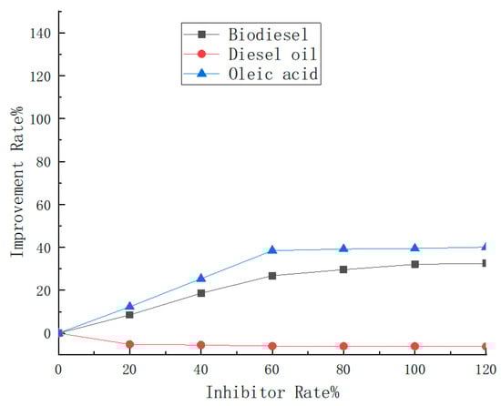 The dispersion improvement rate, R, after adding different concentrations of inhibitors to the model oil is shown in Figure 7. It can be seen that oleic acid has the highest dispersion improvement rate, biodiesel is less efficient than oleic acid, and the negative value of the dispersion rate of diesel oil indicates that it not only fails to inhibit asphaltene but also accelerates the aggregation and precipitation of asphaltene. In general, the improvement rate of asphaltene shows an increasing trend with the increase of inhibitor concentration. The change in the improvement rate in the model oil is not obvious when the biodiesel concentration is at a relatively low concentration. As the biodiesel concentration continuously increased, the asphaltene improvement rate began to increase significantly, and when the biodiesel content reached 60%, the dispersion rate reached more than 35%. This means that only when the biodiesel concentration has reached a certain level, it has a stabilizing effect on the asphaltene in the model oil. However, the amount of biodiesel added also has an upper limit, and when the content exceeds 60%, the increase rate of the improvement effect decreases significantly. The improvement rate of oleic acid can reach 85% at 30% concentration, but when the concentration exceeds 30%, the improvement effect tends to be stable and will not increase with the increase in concentration.