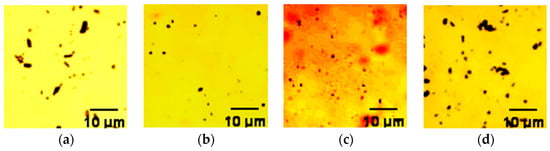 An optical microscope is used to examine the morphology of asphaltene aggregates in the presence and absence of biodiesel and other inhibitors. From Figure 8 we can find that the size and quantity of asphaltene precipitates (black particles in Figure 8a) are quite evident in the absence of any inhibitor, and the diameter of most particles is larger than 3 μm. When diesel oil is added, a high number of asphaltene tend to grow into larger size particles by interacting with each other, which means that diesel oil cannot disperse asphaltene; instead, it accelerates the asphaltene precipitation. After adding biodiesel, the size of asphaltene precipitates reduces significantly, and particles larger than 2 μm are rarely found. The size of asphaltene particles precipitate in the presence of oleic acid is similar to biodiesel, and most of the particles are less than 2 μm. These observations from morphology are consistent with the result of the UV-Vis measurements, which confirm that the functions of ester and carboxy function groups can interact with asphaltene and inhibit its self-aggregation.