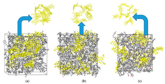 Equilibrium structure of (a) asphaltene in model oil (b) asphaltene in model oil in the presence of biodiesel (c) asphaltene in model oil in the presence of oleic acid (Yellow is asphaltene).