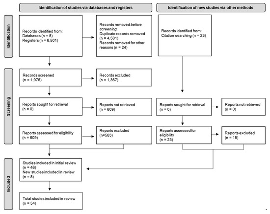 As a final step, the identification and screening stages were repeated for the references cited in the 46 eligible studies. A total of 23 records were first identified, and then screened, leading to eight additional eligible studies. As a result, 54 articles were included in the literature-review analysis. Figure 1 provides an overview of the results of the identification and screening stages through the PRISMA 2020 diagram.