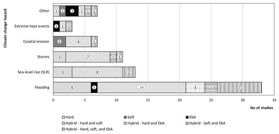 The correspondence between climate-change hazards and adaptation strategies in Figure 3 shows that the combination of hard and soft measures was the most frequently assessed option in the reviewed studies. Flooding was the only hazard addressed by all types of strategies (hard, soft, EbA, and hybrid). Specific measures for flooding included hard-based interventions such as dykes, seawalls, levees, breakwaters, and drainage systems; soft measures like beach nourishment and road, building, and land-elevation plans; and EbA dealing with open urban drainage systems (OUDS) and the restoration of mangroves, wetlands, and barrier and oyster reefs. Optimal hybrid strategies identified combined barrier (hard) and wetland (EbA) alternatives.