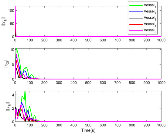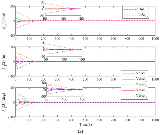 Figure 4 shows that the estimation errors of the nonlinear ESO can get close to zero after a period of time. This indicates that the observed values can approach the true velocities and system uncertainties, which can satisfy the design requirements of the subsequent formation controller. The trajectories of the vessels are shown in Figure 5. It can be seen in Figure 3 that only the first vessel can obtain the information of the expected trajectory, but all vessels can follow the desired trajectories with an expected formation. After maintaining a stable formation, it can be seen in the zoomed-in regions that all the deviations between the actual and the expected trajectories are less than 0.2 m, which meets the requirements of tracking accuracy.