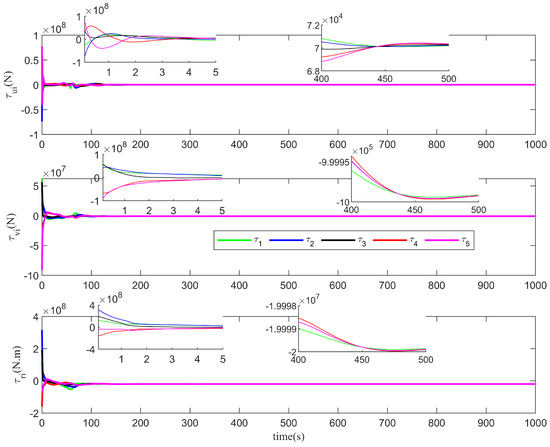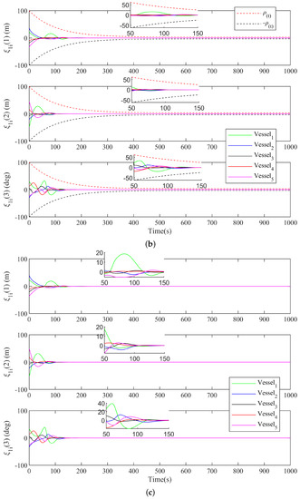 Figure 6a–c show the formation errors under the proposed FTPPF-based controller, conventional PPF-based controller, and controller without PPF, respectively. It can be seen in Figure 6a–c that all the formation errors can finally converge to near zero under the three different control methods. In addition, it can be seen in Figure 6a that the convergence time under the proposed FTPPF-based controller is within the preset time = 150 s. Furthermore, in the zoomed-in areas in Figure 6a–c, we can see that the convergence time under the proposed FTPPF-based controller is approximately 100 s, which is smaller than the convergence times under the other two controllers (almost 110 s and 150 s). Moreover, compared with the zoomed-in areas in Figure 6b,c, the fluctuations of the formation errors are significantly reduced due to the smaller preset constraint bounds of our proposed FTPPF-based controller. Therefore, the superiority of our proposed FTPPF-based method is verified in Figure 6a–c. Figure 7 shows the surge, sway forces, and yaw moments for the vessels. As shown in the zoomed-in area in Figure 7, the control forces and moments are large at the beginning due to the initial large formation errors, as shown in Figure 6a, but maintain relatively small values after maintaining a stable formation.