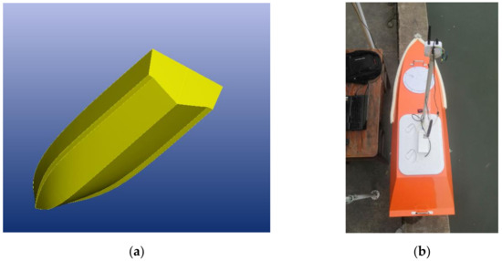 Geometric model and physical model of the USV (a) geometric shape (b) model of the USV.