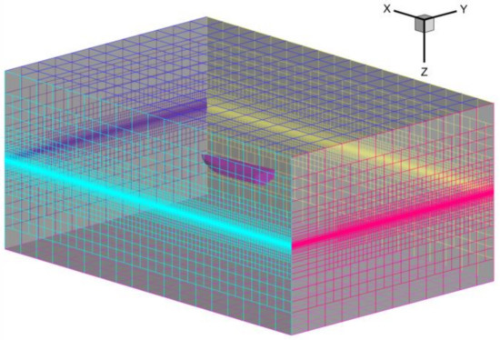 The calculation region is limited to a rectangular solid, whose ranges are , , and . The commercial software Hexpress is used to generate unstructured cutting grids in the calculation area. The calculation grid in the calculation area is shown in Figure 3, and the number of grid cells is about 1.6 million.