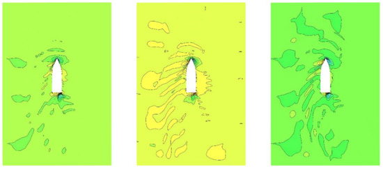 The coupled hydrodynamics of oblique motion and circling motion of the USV are calculated. The ship’s length Fourier coefficient is 0.2, the drift angles are 0 degrees, ±10 degrees, and ±20 degrees, and the dimensionless steering angular speeds are 0, ±0.4, and ±0.8. Figure 6 shows the ripple of the coupled motion. It can be seen that the variation tendency of the ripple around the hull is reasonable.