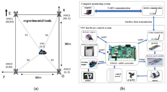 The size of the experimental tank is 60 m × 80 m, the test coordinate system was established as shown in Figure 7a, and the lower right corner of the tank was taken as the origin. Four UWB base stations are placed at the four corners of the tank, covering the range of the test; USV coordinates were calculated using the distance, S0, S1, S2 and S3, from the USV to the four base stations, according to the trilateration measurement method [28]. Using four UWB instead of three UWB could effectively improve positioning accuracy.