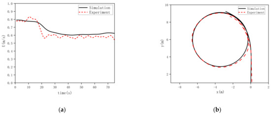Comparison of the prediction and experiment in the 30° turning circle. (a) Speed comparison. (b) Track comparison.