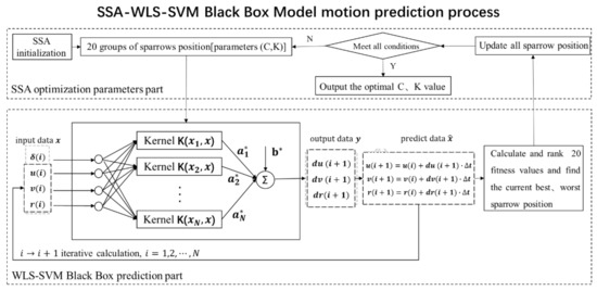 The black-box model is commonly used in neural network and fuzzy control models. The core algorithm of the neural network is based on the principle of empirical risk minimization, which has a problem of “over fitting” in practice. Vapnik [33] first introduced support vector machines (SVMs) in 1995 to solve the problem of pattern recognition. The standard support vector machine (SVM) uses the structural risk minimization principle to overcome this shortcoming and has the advantages of robustness and sparsity. Robustness means that its solution is stable, and sparsity means that the training samples are all effective support vectors that contribute to the objective function. However, the parameter adjustment on the SVM algorithm is relatively difficult, and the calculation amount brought by inequality is large. The least squares support vector machine (LSSVM) is an extension of SVM, which improves the solving speed of the black-box model but loses the advantages of the robustness and sparsity of the SVM. In this paper, a black-box model with weighted least squares support vector machine (WLS-SVM) based on the Sparrow search algorithm (SSA) is proposed to perform regression training on USV motion samples.