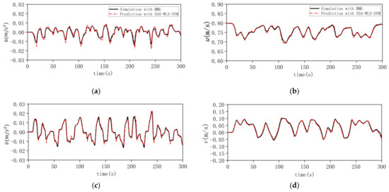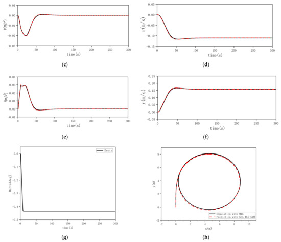 The trained SVM is used to predict the entire navigation process in the random maneuvering dataset 1, and longitudinal acceleration , lateral acceleration , steering angular acceleration can be outputted. Subsequently, the longitudinal velocity , lateral velocity , steering angular speed , and USV track can also be obtained. As shown in Figure 12, by comparing the prediction results of SSA-WLS-SVM with the simulation results of the MMG model, it can be concluded that the black-box modeling and prediction method based on SSA-WLS-SVM can accurately predict the ship’s 3-DOF motion.