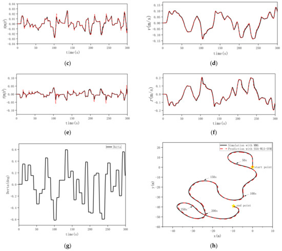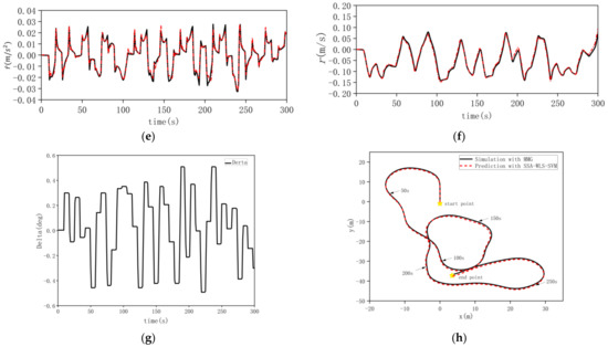 Comparison of the prediction with SSA-WLS-SVM and simulation in dataset 2. (a) Longitudinal acceleration. (b) Longitudinal velocity. (c) Lateral acceleration. (d) Lateral velocity. (e) Steering angular acceleration. (f) Steering angular speed. (g) Rudder angle. (h) Track of USV.