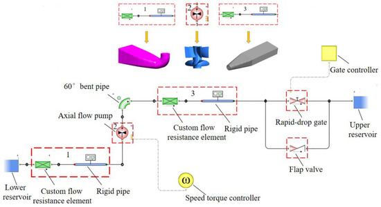 The model is built based on the Flomaster software platform [27,28]. Figure 2 shows the simulation model platform involving all of the components, such as the flap valve and the rapid-drop gate. Among them, element 1 and element 3 represent the inlet and outlet channels, which are realized in the form of user-defined flow resistance elements and rigid pipes; element 2 represents the axial flow pump model, and the pump speed control is realized through the pump speed controller. Element 5 represents the rapid-drop gate, and the gate control is realized through the gate controller. Element 6 represents the flap valve attached to the rapid-drop gate. Table 4 shows the hydraulic loss coefficient of the flap valve at different opening angles.