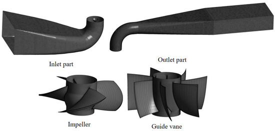 The pressure drop characteristics required in Flomaster are obtained by CFD (based on ANSYS CFX). In the numerical simulation, the flow density in LAPS is assumed to be constant, and the Reynolds time-averaged equation is used to control the LAPS model. In order to obtain an effective solution to the equation, the SST k-ω turbulence model is selected to close the equation [29,30,31]. For the LAPS, the inlet adopts the speed inlet condition, and the outlet adopts the free outflow condition. Figure 3 shows the grid diagram of each flow passage component in the CFD calculation. The inlet part and outlet part are divided by an unstructured grid. The impeller and guide vane are divided by structured grids. At the same time, the grid of the impeller and guide vane near the shroud is densified. Figure 4 shows the grid independence analysis of the calculation model. Taking the head and efficiency as the evaluation indicators of whether the number of grids meets the requirements, it can be seen that the head and efficiency fluctuate in a small range when the overall number of grids reaches 5 million. In order to save the calculation cost, this study uses 5.16 million grids for the CFD calculation.
