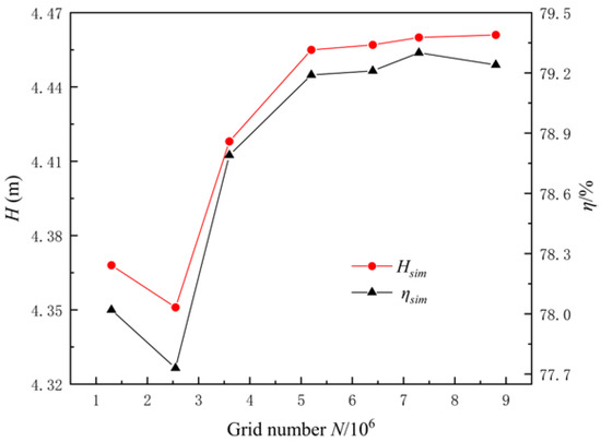 Grid independence analysis of head and efficiency of the LAPS.