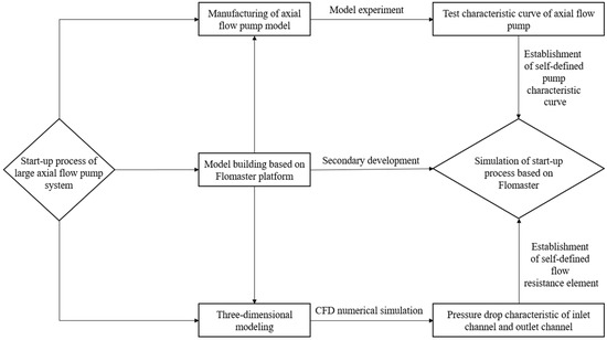 Figure 5 shows the strategy flow chart of this numerical calculation, primarily concerning how to combine Flomaster, the pump test and CFD. The principle is to conduct the pump test and CFD calculation of the pump system first, obtain the pump test performance curve and the pressure drop curve of the flow channel and flap valve, store the obtained performance curve in the database of Flomaster in the form of a Suter curve, then add the pressure drop characteristics of the flow channel and flap valve predicted by CFD to the elements, and finally, calculate the pump station transition process. As the Flomaster software does not directly calculate the transition process of the pump station, some of the data, such as the performance curve and pressure drop curve, need to be given. Therefore, the process of storing the data in Flomaster for further calculation is called the secondary development of the Flomaster software.
