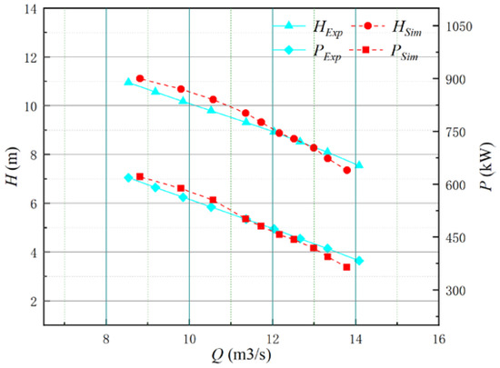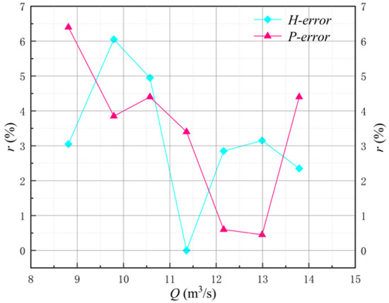In order to prove the feasibility and accuracy of the results of the Flomaster simulation platform constructed in this paper, we build the LAPS model in the key laboratory and carry out the steady-state energy characteristic test and transient power-off runaway test for the large axial flow pumping station system model [33]. Figure 7 shows the energy characteristics of the LAPS. It can be found from Figure 7 that the head and shaft power measured by the model test under the design flow rate (Qdes = 12.79 m3/s) are almost the same as those obtained in the Flomaster. The more flow deviating from the design flow rate, the greater the error between them, but the maximum error is less than 3%, indicating that the Flomaster simulation platform constructed in this paper has high accuracy in the energy characteristic test of the steady-state simulation. Figure 8 shows the error analysis diagram between the experimental test and the numerical simulation when comparing the steady-state energy characteristic experiment. From the error trend of the head and shaft power in Figure 8, it can be seen that with the increase in the flow, the error value of the head and shaft power obtained by the numerical simulation gradually decreases. Under the design flow, the head error is approximately 3.0%, the power error is approximately 0.5%, and the overall error meets the calculation requirements of the pump station transition process.