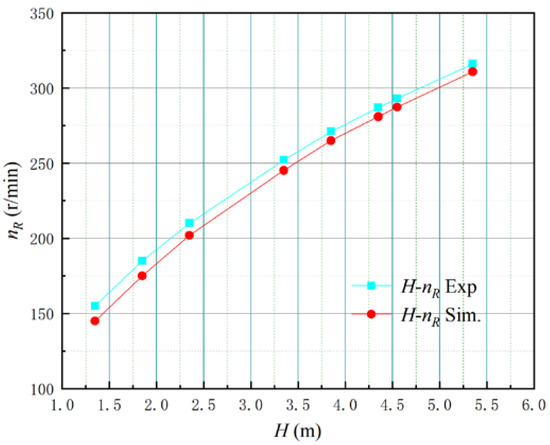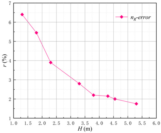 Figure 9 shows the runaway speed of the pump after the power-off of the LAPS under different heads. It can be found from Figure 9 that the runaway speed measured by the model test at the design head (Hdes = 4.55 m) is very close to that obtained by the Flomaster, and the variation law is also very consistent. The runaway points obtained by the test are all higher than those obtained by the Flomaster simulation platform, but the maximum error is less than 3%, indicating that the Flomaster simulation platform constructed in this paper has high accuracy in the power-off runaway test of the transient simulation. Figure 10 shows the error analysis between the experimental test and the numerical simulation when comparing the transient power-off runaway test. It can be seen from the variation trend of the speed error with different water levels in Figure 10 that the runaway speed error value obtained by the numerical simulation gradually decreases with the increase in the water level. Under the design head, the error value of the runaway speed is approximately 2.0%, and the overall error meets the calculation requirements of the pump station transition process.