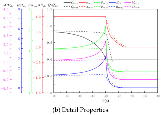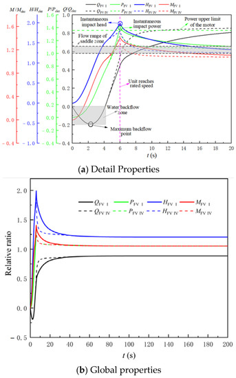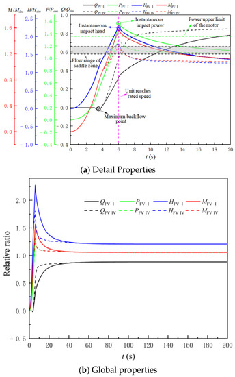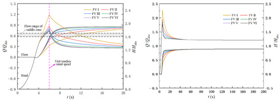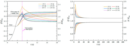 Figure 11 shows the start-up characteristic curve of the LAPS during the synchronous start-up process, before and after the additional flap valve. It can be seen from Figure 11 that the growth rate of the flow is significantly accelerated, and the instantaneous head, power and torque are significantly reduced in the synchronous start-up process of the LAPS with a flap valve compared with that without a flap valve. With the FV Ⅳ, the time required for the LAPS to transition from the start-up to stable operation is shortened by approximately 11.3 s. The maximum impact power of the LAPS reduces the 0.1 Pdes, does not exceed the upper limit of the motor power, and will not cause motor overload.