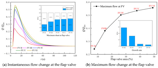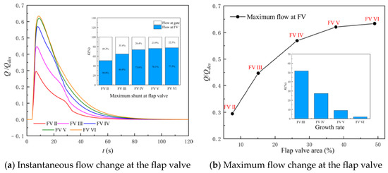 Figure 12 shows the shunt ability of the different AOF during the synchronous start-up process. According to Figure 12, the following conclusions can be drawn. Firstly, in the process of synchronous start-up, with the increase in the AOF, the shunt ability of the flap valve in the start-up process is gradually enhanced. With FV Ⅱ, when t is 7.1 s, the flow at the flap valve reaches the maximum value of 0.24 Qdes, accounting for 36.4% of the total LAPS flow. With FV Ⅵ, when t is 8.55 s, the flow at the flap valve reaches the maximum value of 0.56 Qdes, accounting for 68.1% of the total LAPS flow. Secondly, in the process of synchronous start-up, when the AOF is smaller than that of 26% Ag, increasing the AOF can significantly improve the shunt ability of the flap valve during the start-up process. When the AOF increases from 8% Ag to 15% Ag, the maximum flow rate of the flap valve during the start-up process increases by 57.8%. Thirdly, when the AOF reaches 26% Ag, further increasing the AOF has no obvious gain in improving the shunt ability of the flap valve in the start-up process. When the AOF increases from 26% Ag to 38% Ag, the maximum flow of the flap valve during the start-up process increases by only 6.5%.