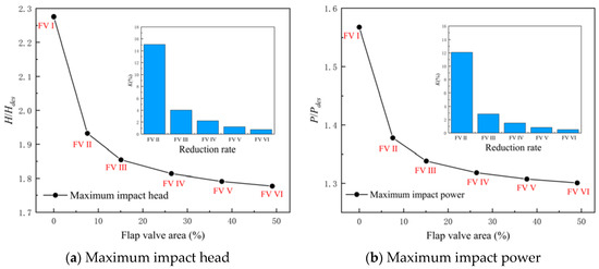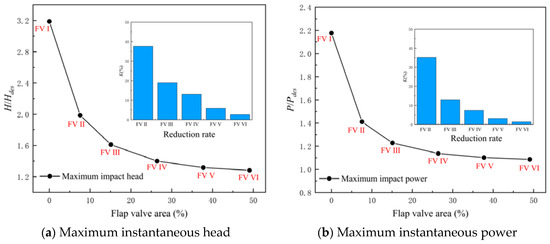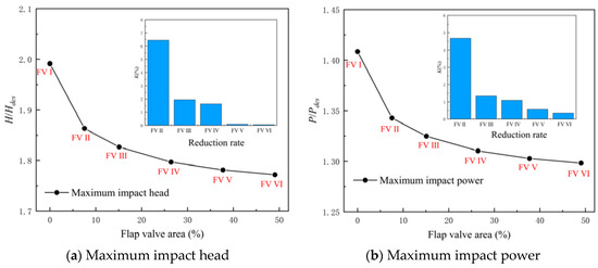 Figure 14 shows the maximum impact head and power of the LAPS during the synchronous start-up process. The following conclusions can be drawn from Figure 14. Firstly, in the process of synchronous start-up, increasing the flap valve can significantly reduce the maximum impact head and power of the LAPS. Secondly, when the AOF is smaller than 26% Ag, increasing the AOF can further reduce the maximum impact head and power of the LAPS. Thirdly, when the AOF reaches 26% Ag, further increasing the AOF has no obvious gain in reducing the maximum impact head and power of the LAPS. When the AOF increases from 26% Ag to 38% Ag, the maximum impact head and power of the LAPS are only reduced by 0.08% and 0.57%.