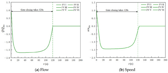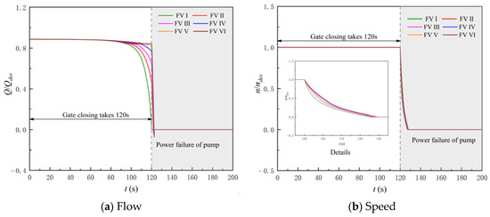 In order to reduce the runaway time and reverse the speed of the pump during the shutdown process, the motor and the rapid-drop gate usually cooperate asynchronously. Asynchronous cooperation means that the closing of the rapid-drop gate is earlier than the power failure of the motor. In this paper, the asynchronous cooperation shutdown process of the motor and gate is defined as the asynchronous shutdown process. In order to explore the influence of the different AOF on the LAPS’s asynchronous shutdown process, this section takes the transient simulation of the LAPS’s asynchronous shutdown process with different AOF. It should be noted that during the asynchronous shutdown process, in this section, when the rapid-drop gate is completely closed, the unit will be powered off.