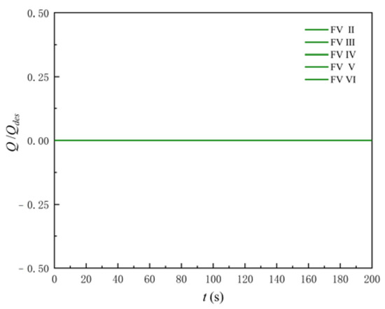 Figure 23 shows the shunt ability of the different AOF during the asynchronous shutdown process. According to Figure 23, the following conclusions can be drawn. Firstly, in the process of asynchronous shutdown, the time when the flap valve starts to shunt is not affected by the AOF. Secondly, in the process of asynchronous shutdown, with the increase in the AOF, the shunt ability of the flap valve in the shutdown process is gradually enhanced. With FV Ⅱ, when t is 120 s, the flow at the flap valve reaches the maximum value 0.448 Qdes, accounting for 100% of the total LAPS flow. With FV Ⅵ, when t is 120 s, the flow at the flap valve reaches the maximum value 0.84 Qdes, accounting for 100% of the total LAPS flow. Thirdly, when the AOF reaches 38% Ag, further increasing the AOF has no obvious gain in improving the shunt ability of the flap valve in the process of asynchronous shutdown. When the AOF increases from 38% Ag to 49% Ag, the maximum flow of the flap valve during the shutdown process increases by only 2.08%.