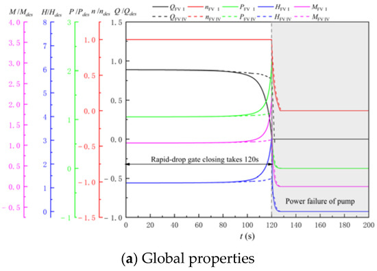 Figure 21 shows the shutdown characteristic curve of the LAPS before and after the additional flap valve during the asynchronous shutdown process. It can be seen from Figure 21 that compared with no flap valve, the LAPS with a flap valve changes smoothly during the asynchronous shutdown process. The flow attenuation speed of the LAPS becomes slower due to the rapid-drop gate closing, and the maximum instantaneous head and power also decrease accordingly. Compared with FV Ⅰ, the maximum instantaneous power of the LAPS is reduced by 1.04 Pdes after adopting FV Ⅳ, which does not exceed the upper limit of the motor power and will not cause motor overload.
