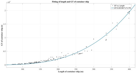 Figure 3. The relationship between the length and GT of container ship.Based on the relationship between the length and GT, the fitted formula in the study [33] is selected to measure the relationship between GT and main engine power of the container ship:The engine power of the fishing ship is calculated using the Statistical Yearbook of Guangdong Province. In 2020, there were 2115 fishing ships in Shenzhen, with a total power of 110,728 kW. It is difficult to complete a detailed division of the types and operation modes; as such, this study uses the average value of 110,728/2115 =52.4 kW as the main engine power of an average fishing ship in Shenzhen Port. - 2)