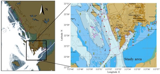 In a port area, there is more ship traffic and more pollutants are discharged; the harmfulness of pollutant diffusion increases with an increase in ship traffic. Therefore, a simulation experiment for an area with a large ship-traffic flow that is close to the land can effectively represent the impact of pollutant diffusion on people and the environment. The Shenzhen West Port Area, China is such an area, as shown in Figure 4.