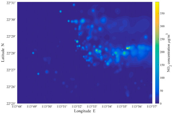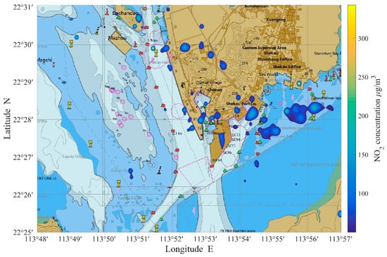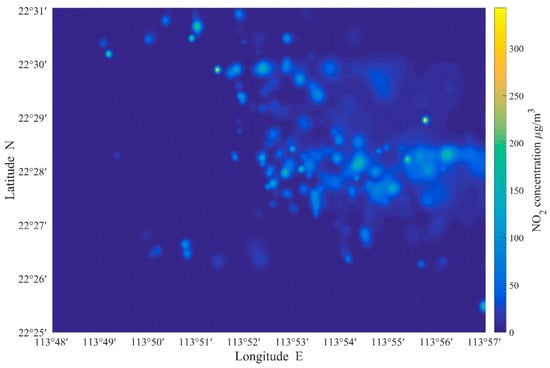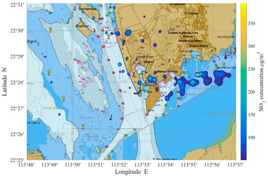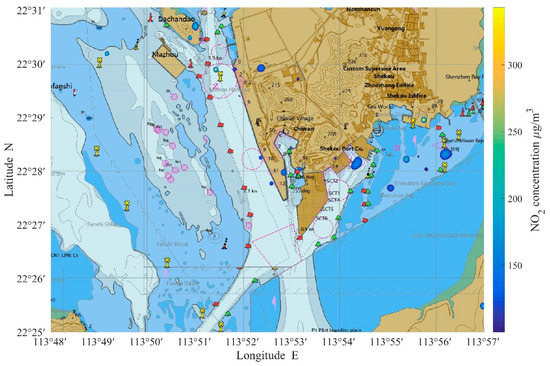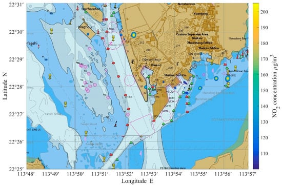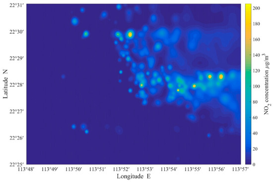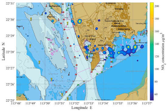 IAQI is positively correlated with the concentration limits of different pollutants after the diffusion of ship exhaust, as shown in Table 9. Combined with Equation (1), it indicates that the concentration limit after pollutant diffusion is positively correlated with the quality of pollutants discharged from ships. Gan et al. [37] calculated the SOX, NOX, CO, PM10, PM2.5, and VOCs of ship emissions in the western area of Shenzhen Port in 2018, with results of 2683.1 t, 7273.0 t, 615.5 t, 398.6 t, 366.8 t, and 295.9 t, respectively. It indicates that NO2 is most likely to reach a higher IAQI value (NO and NO2 account for more than 90% of NOx [38], and NO is easily oxidized to NO2). It can be considered that NOx diffusion is equivalent to NO2 diffusion, so NO2 is selected as the representative pollutant for this simulation, using the NO2 concentrations exceeding (good air quality) and (slight pollution) to measure the degree of air pollution and the impact on human health.